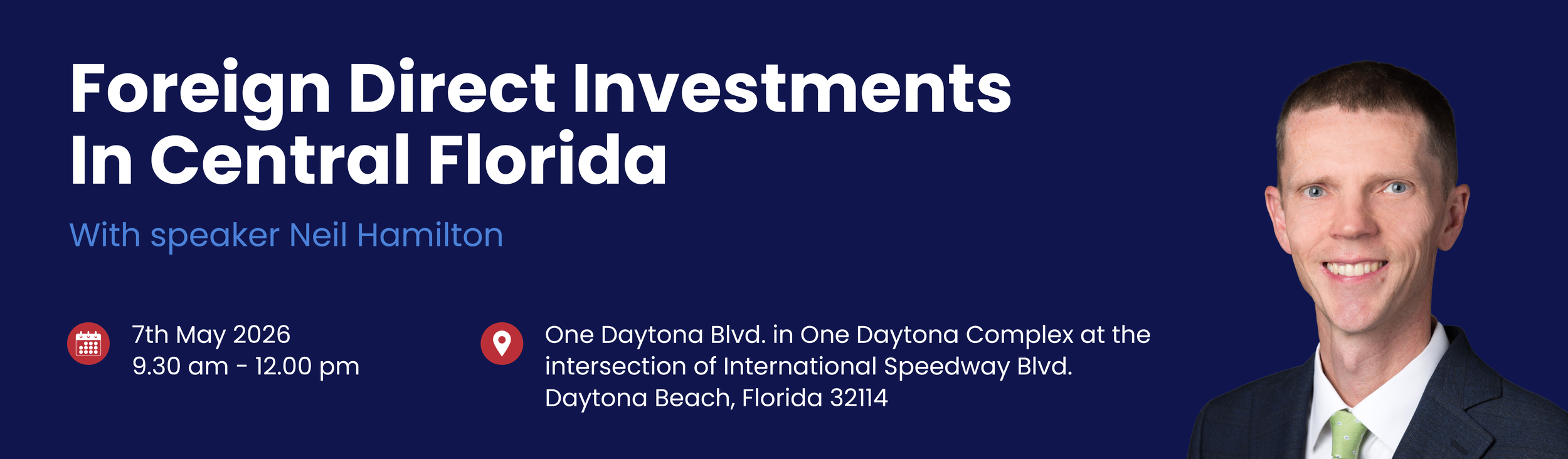 Join us for the BABC Foreign Direct Investments in Central Florida with speaker Neil Hamilton, Vice President of Research & Strategy at the Orlando Economic Partnership. Taking place on May 7th, 2026, from 9:30 AM to 12:00 PM at the International Motorsports Center in Daytona Beach, this session will offer valuable insights into the region’s economic landscape and future outlook. This is a fantastic opportunity to connect with fellow professionals and gain expert perspective.