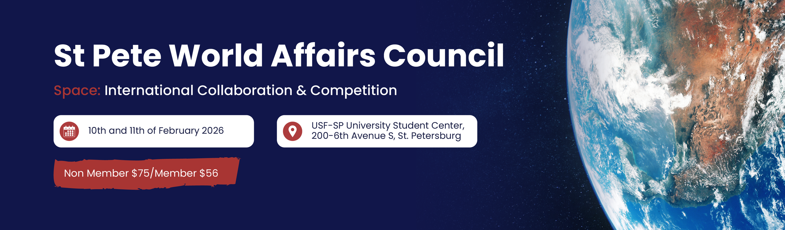 The St. Petersburg World Affairs Council (SPWAC) presents our 2026 Conference, “Space: International Collaboration and Competition,” in partnership with USF, the Global and National Security Institute, the British-American Business Council, and leaders in academia and industry. Outer space is the new frontier for competition over critical resources and lucrative commerce. Determining who gets access to — and control of — those resources creates complexities for how companies and countries interact on earth. Full schedule to be posted on SPWAC.org.